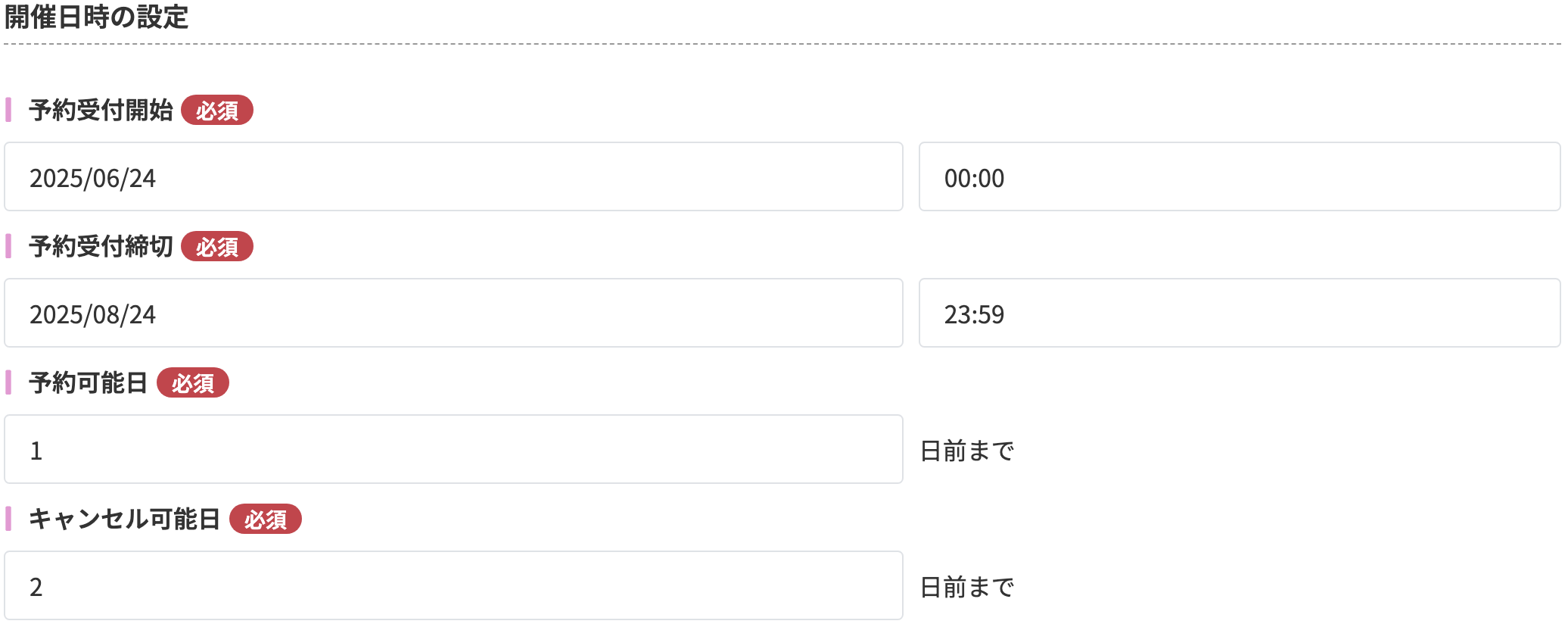 まず、投稿する時に設定していただいた開催期間をもとに、予約を受け付ける日時などの設定をします。